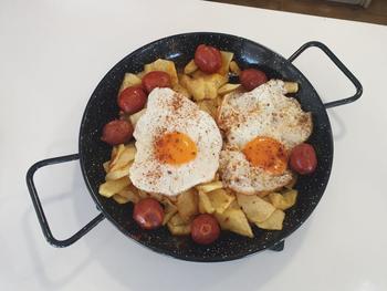 Sartén de Huevos Rotos con Patata Frita Casera y Chorizo